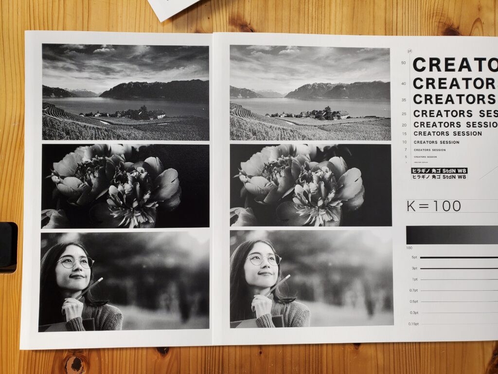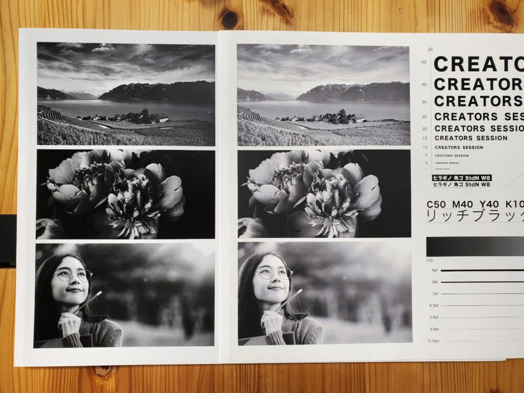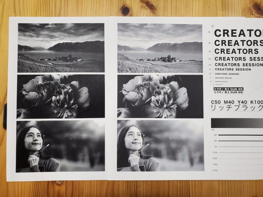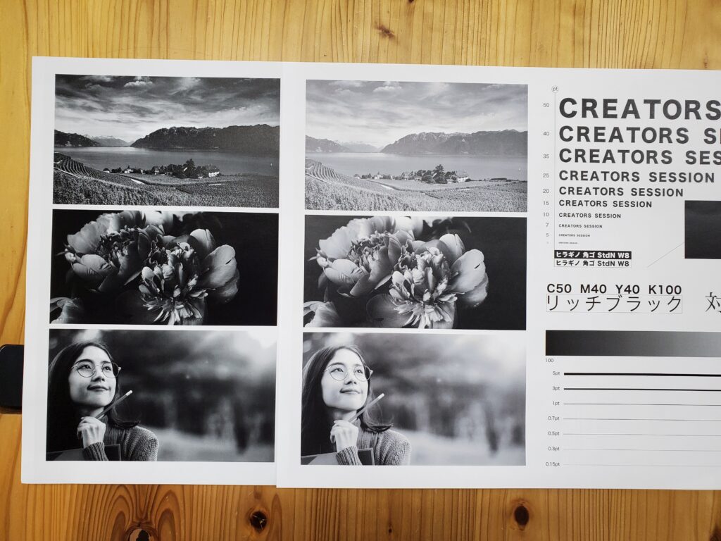 スミベタとリッチブラックの仕上がりには差がありました。リッチブラックは4色使用している分細かい表現がきれいな印象です。スミベタと比べて深みが出ています。特にモンテシオンはスミベタとリッチブラックの差がわかりやすい仕上がりでした。