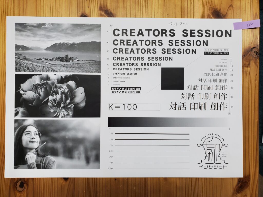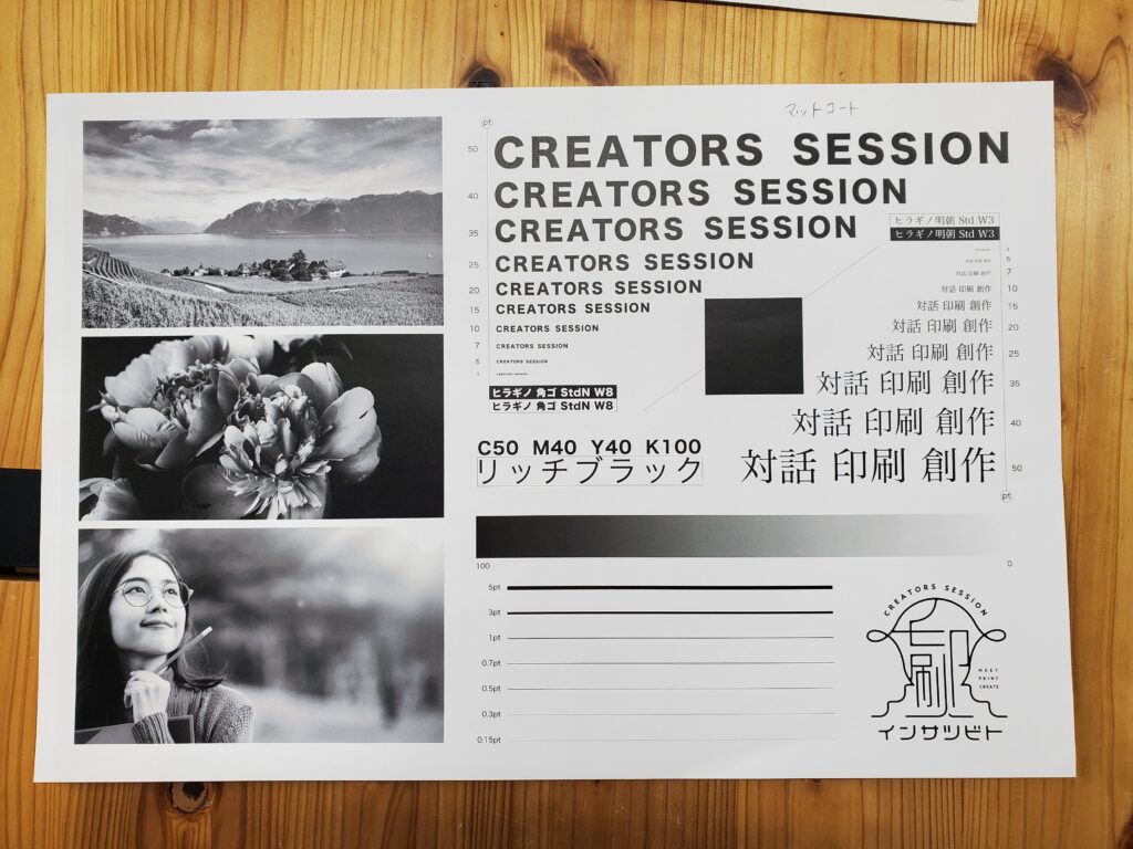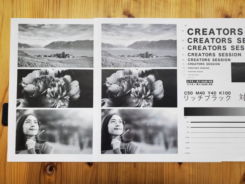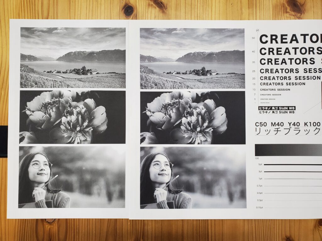 実験で使用したデータは、スミベタ(スミ100%)とリッチブラック(CMYKの掛け合わせ)の2種類です。リッチブラックはC50・M40・Y40・K100の掛け合わせです。