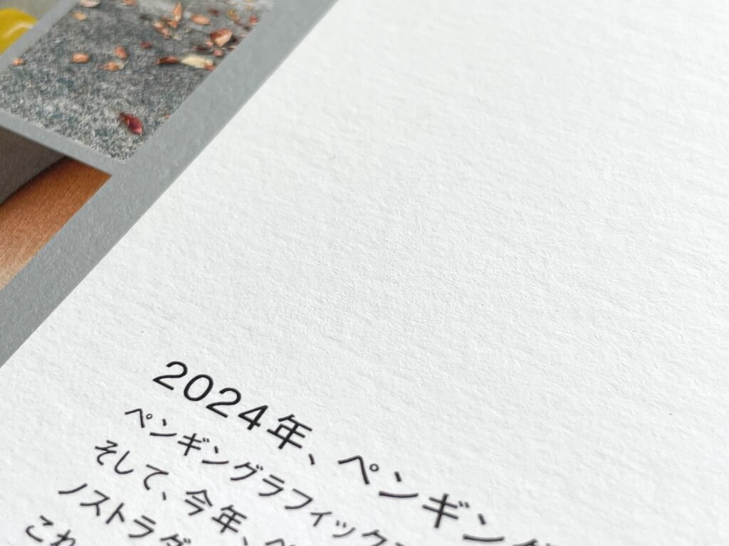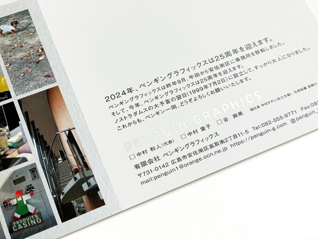 長らく牛田に事務所を構えられていましたペンギングラフィックスさん。2023年の9月に安佐南区へ事務所を移転されたとの事で、そのお知らせと2024年が創業25周年ということでその挨拶も兼ねたDMの印刷をお願いしたいとご相談をいただきました。ご要望は「なるべく厚目で、ラフな質感、それでラフグロス系のものにしたいね。あとデジタルオフセットのシルバーも発色のいいヤツお願い!」との事。ここで問題なのが、ラフグロス系のファイペーパーで厚手のものってほとんどないんですよね、、、基本厚手のものが再生板紙か白い紙でもマットな仕上がりだったり、そもそも印刷適性が無いものがほとんど。「合紙してもええで」とも言われたのですが、それだとスケジュール的に難しそうでしたので見送りました。