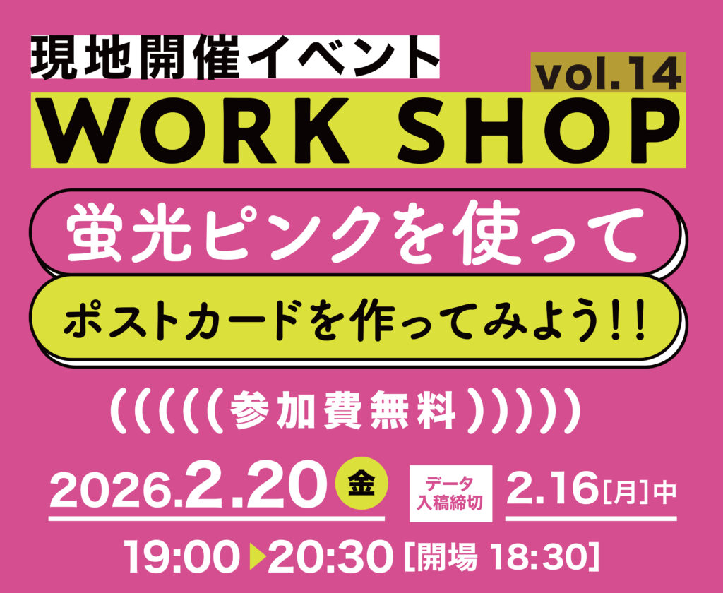 今回は、人気のデジタルオフセット印刷機の蛍光ピンクインキを使ってポストカードが印刷できるワークショップを開催します!《本ワークショップは原則illustratorやPhotoshopにてデータを作成できる人が対象です。》