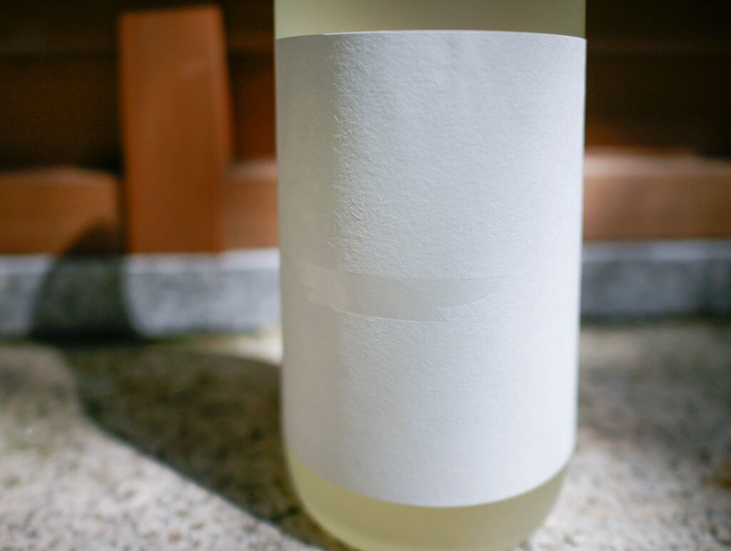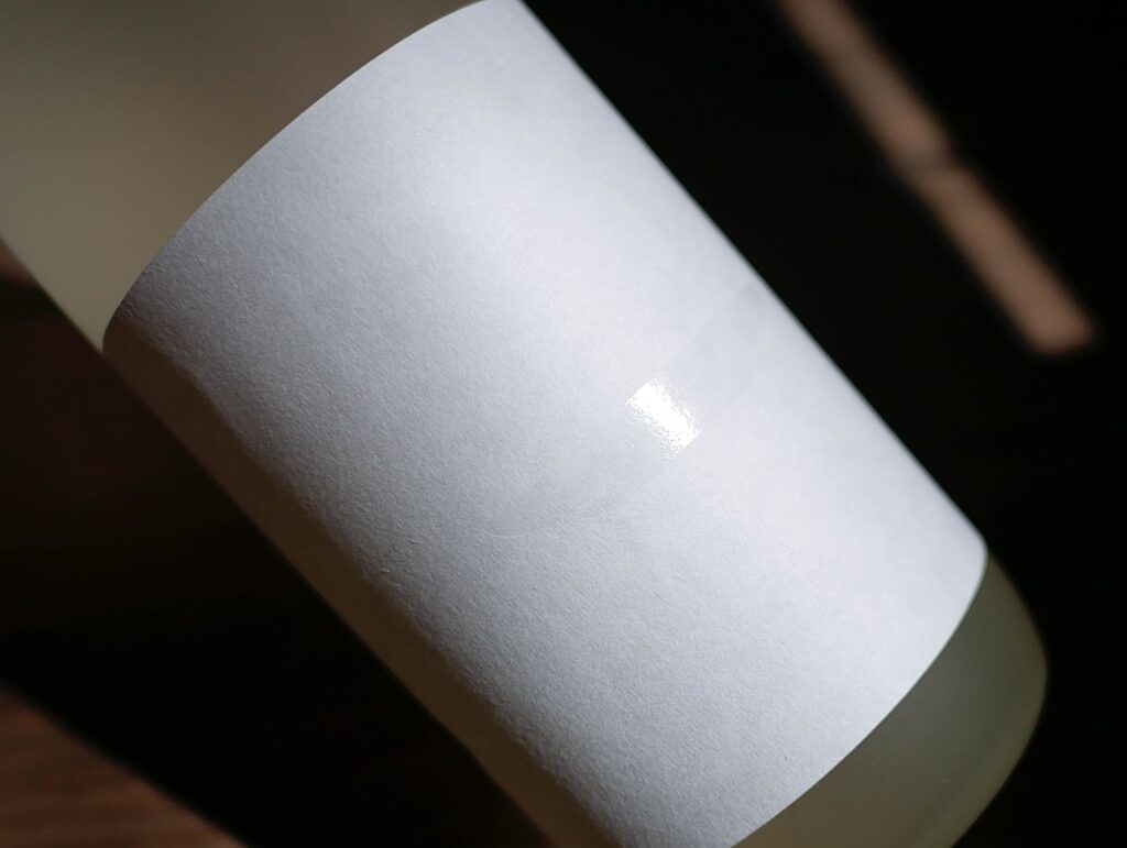 それらの壮大なプロジェクトをデザインに落とし込むには、完成までに長い時間を要しました。初案は、田植え時から祈願をした神聖なお酒であることから、神主が書いた商品名をど真ん中にストレートに配置し、用紙も大礼紙を使い、インキも朱赤やゴールド表現を使うことで神社感を押し出そうとしていました。ただ店頭で他の商品と並べられた時の差別化をしたい、そしてプロジェクト自体チャレンジングなもの。デザインももっと尖ってていいのではないか?余計なものを極限まで削ぎ落としたものはできないか?という方向性になりゼロから再構築しました。ラベル用紙はフワっと優しくお米のように純白な「和紙コットン」に決定。一味神水を象徴する“盃”、このシルエットをキラリと光るクリア箔で瑞々しさを表現し、瓶を正面からみた時にそれ以外の余計な情報が入らないよう空間を設計。瓶はフロストガラス、キャップはツヤ消し銀に白く塗装されたものを採用。この究極な引き算のデザインで、神聖なる佇まいを醸成する事に辿り着きました。