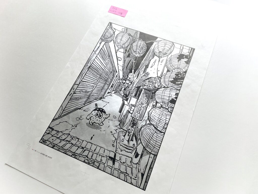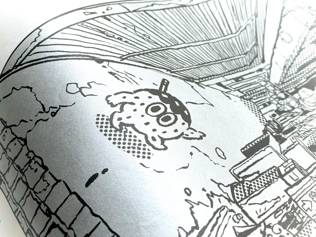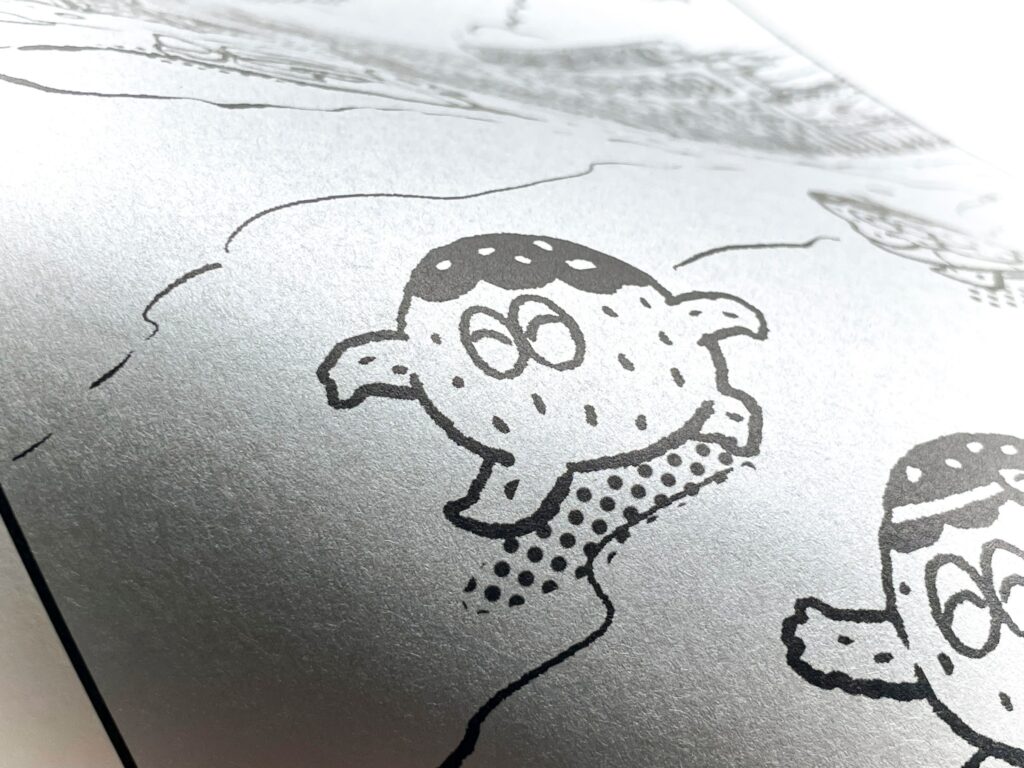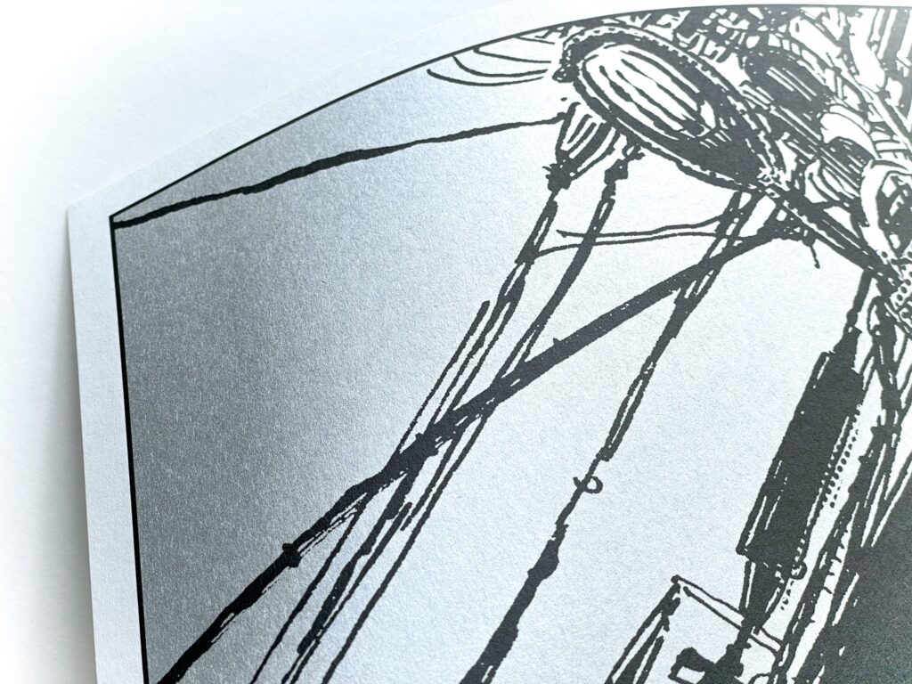 そのお話の中で「背景が白で黒で描き上げた作品もあります。その背景を全面シルバーとかできますか?」とご相談いただいたのですが、デジタルオフセットのシルバーが広いベタ面への印刷の場合、ムラが発生する可能性大だったので当初はお断りさせていただいたのですが、コチラとしてもなんとかそのアイデアを実現できないか?と考えたところ、元々紙の繊維感があるザラっとした用紙で印刷すればムラも目立たない、もしくは味として見えるのでは?と思いコチラからの提案でOKブリザードとモンテシオンに実験で印刷してみました!印圧を変えたり、印刷の方向を変えてみたりすると大成功!タダさんにも見ていただき「めちゃくちゃ良いです!」とのお声をいただきました。